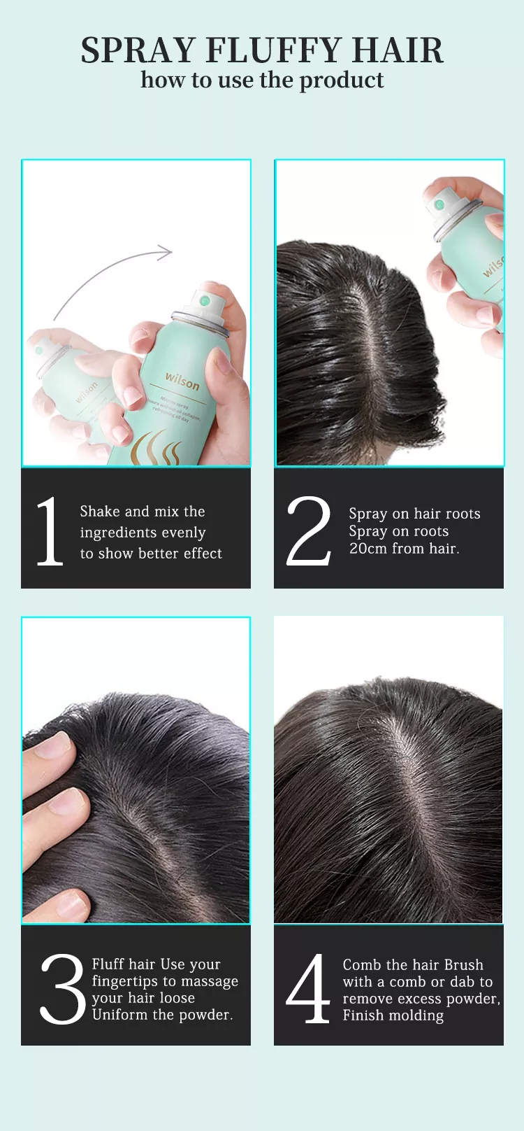 Wilson instiriqli quruq shampun püskürtün, trication, b5 vitamini va sochni to'ldirish, sochni tashqi muhitni to'ldirish, boshni tashqi muhitdan himoya qilish va nihoyat sog'lom sochni tiklash maqsadida.